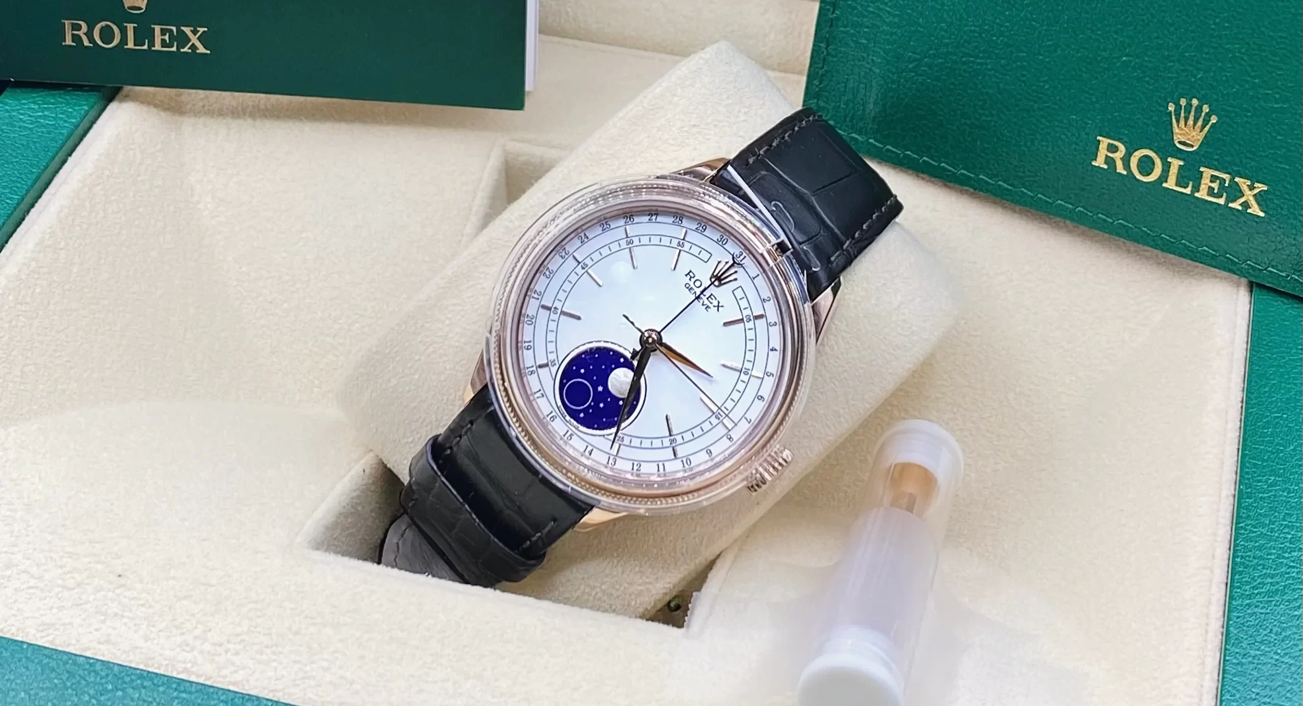 冒頭の画像にあるチェリーニ ムーンフェイズ は、2017年に発表されたモデルで、ロレックスのクラシックなドレスウォッチラインであるチェリーニコレクションに属していました。